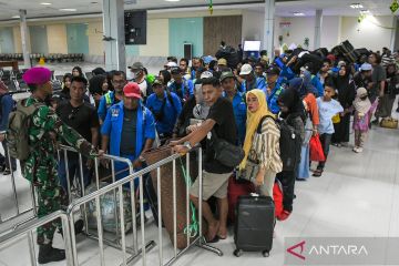 Pemudik membawa barang bawaan saat antre masuk ke dalam kapal Pelni KM Dobonsolo di Pelabuhan Tanjung Priok, Jakarta, Selasa (25/3/2025). PT Pelni mencatat sebanyak 1.600 penumpang mudik menggunakan KM Dobonsolo dengan tujuan Surabaya, Makassar, Bau-Bau, Ambon, Banda, Tual, Dobo, Kaimana, dan Fak-Fak. ANTARA FOTO/Sulthony Hasanuddin/nz