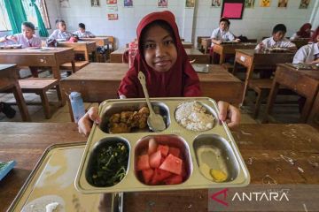 Seorang siswi sekolah dasar menunjukkan menu makanan bergizi gratis di SDN 10 Kendari, Kendari, Sulawesi Tenggara, Senin (6/1/2025). Badan Gizi Nasional (BGN) melaksanakan program makan bergizi gratis perdana di sejumlah sekolah di Kota Kendari guna mematangkan ketepatan waktu distribusi serta kecukupan kandungan gizinya. ANTARA FOTO/Andry Denisah/rwa.