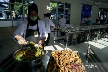 Petugas dapur menyiapkan menu makan siang untuk didistribusikan ke sekolah-sekolah pada Program Makan Bergizi Gratis (MBG) oleh Satuan Pelayanan Pemenuhan Gizi (SPPG) di Lanud Adi Soemarmo, Karanganyar, Jawa Tengah, Senin (6/1/2025). Pemerintah mulai hari ini mengoperasikan 190 satuan pemenuhan pelayanan gizi (SPPG) atau dapur MPG yang tersebar di 26 provinsi dan berharap target 937 dapur MBG dapat tercapai pada akhir Januari 2025. ANTARA FOTO/Mohammad Ayudha/rwa.