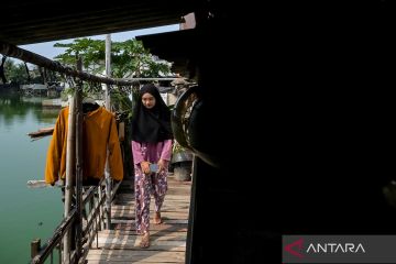 Warga melintas di Kampung Apung, Kapuk Teko, Jakarta, Jumat (25/10/2024). Warga yang telah tinggal di atas air selama puluhan tahun itu berharap bisa mendapatkan akses air bersih dan jalan masuk beraspal ke wilayah mereka berkenaan adanya Pilgub DKI Jakarta. ANTARA FOTO/Rivan Awal Lingga/agr